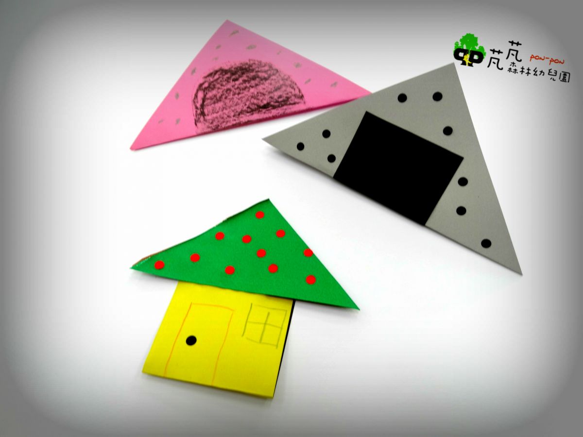 孩子可能會看著自己的三角形,說出「我要把它變成房屋的屋頂」、「變成山」、「這是飯糰」、「這是一個人」等各種多元的答案。父母師長們在孩子說出答案後,可引導孩子把這個三角形貼在素色的紙上,並且問孩子「那我們要加些什麼東西,讓他看起來更像飯糰呢?」鼓勵孩子透過畫筆或黏貼等各種不同的方法,針對紙上所貼的三角形進行加工,讓三角形變得更像飯糰。