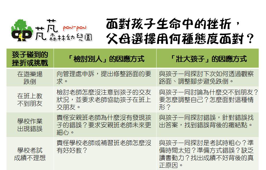擁抱孩子生命中的每一次的挫折,選擇壯大孩子,不檢討他人,能夠讓孩子從中發展出面對挫折的策略。這樣的態度,能夠讓每一次的挫折挑戰成為增強孩子能力的契機,擴大孩子的能力和格局。讓每一次的挫折挑戰,累積成孩子的生命厚度,成為灌溉他們茁壯的養分。