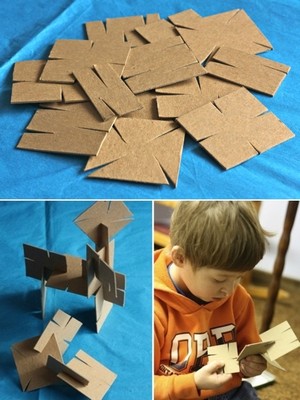 如果喜歡 DIY 的家庭其實也可以不用花錢,就幫小朋友「變」出建構式玩具!用 DIY 好朋友─紙箱、厚紙板,找比較不容易撕裂或彎曲的,先剪成正方形後,沿著邊緣或角角,切出非常窄的 V 形槽卡榫,還可以加工上色,小朋友就可以玩的不亦樂乎了。